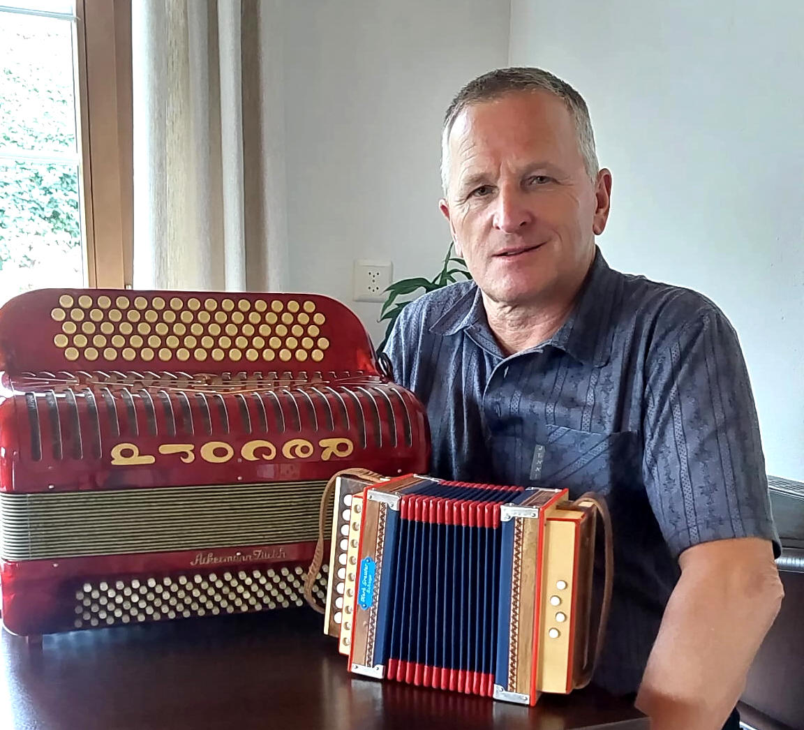 Der gelernte Landmaschinenmechaniker, Sepp Herger, arbeitet beim Strasseninspektorat NW als Metallbauer. Er wurde am 16. Januar 1962 in Buochs geboren. Seine Kindheit verbrachte er zusammen mit einer Schwester und vier Brüdern auf dem Bauernhof „Hostatt“. Musik und Jodelgesang war immer ein wichtiger Bestandteil in seinem Leben, er hatte schon seit der Kindheit grosse Freude an der Musik. Sepp wohnt in Buochs mit seiner Frau Ursula. Gemeinsam haben sie 3 Kinder und drei Grosskinder. Während der Schulzeit kauften ihm seine Eltern eine diatonische Handorgel. Bei Frau Wymann in Beckenried besuchte er den Unterricht. Mit 12 Jahren erlernte er das Spielen auf der chromatischen Handorgel und später spielte er zusätzlich noch auf dem Miniörgeli. Sepp hat in verschiedenen Formationen gespielt und ausgeholfen. Etwa bei den Gosmerbuebä, der Alpegruessmuisig, bei Berchtold - Wallimann, bei H2O usw. Als Urner hat ihn vor allem die Kapelle Echo vom Kinzig fasziniert. Er spielt gerne Eigenkompositionen oder Tänze von Josef Imholz. Seinen Musikstil bezeichnet er selber als eine Mischung von Kinzig und Illgauerstil. Verschiedene CD-Produktionen sind in all den Jahren entstanden und in zwei Sendungen „Hopp dä Bäse“ durfte er auftreten. Neben der Volksmusik ist Sepp ein leidenschaftlicher Jodler und Komponist. 1982 am ZSJV Jodlerfest in Stans startete er seine Jodlerlaufbahn als Einzeljodler. Er begleitet sich dabei selber auf der Handorgel. 1984 war er Gründungsmitglied der Jodlergruppe Alpegruess Buochs-Ennetbürgen. Am Gründungskonzert ertönte sein erster Naturjuiz «dä Alpegriässler». Mit der Zeit sind verschiedene Jodellieder, Naturjuize und Musikstücke entstanden. Seit 2006 singt er mit der Jodlerfamilie Herger. Seine Jodelvorbilder sind die Jodlergruppe Bärgröseli Alpnachstad und die Jodlerfründe von Stauffenalp. Nach und nach entstanden viele schöne Begegnungen und Freundschaften dank der Volksmusik und dem Jodeln. Es gäbe viele Erlebnisse zu erzählen. Was ihm in bester Erinnerung bleibt, ist ein Auftritt auf dem Jungfraujoch mit seinem Bruder Tobias und Willi Michel. Dort lernten sie Schwingerkönig Kilian Wenger, Gölä und die Boxer Wladimir Klitschko und Tony Thompson kennen. Auch die verschiedenen CD-Vorstellungen gehören zu den Höhepunkten, besonders jene 2023 in Fischen im Allgäu. Die Jodlergruppe Hörnerblick präsentierte ihre CD „Heimatstolz“ mit Kompositionen von Sepp Herger und Texten vom Allgäuer Florian Ruppaner. Sepp wünscht sich für die Zukunft vor allem gute Gesundheit und weiterhin viele schöne Erlebnisse mit der Familie und Freunden. |