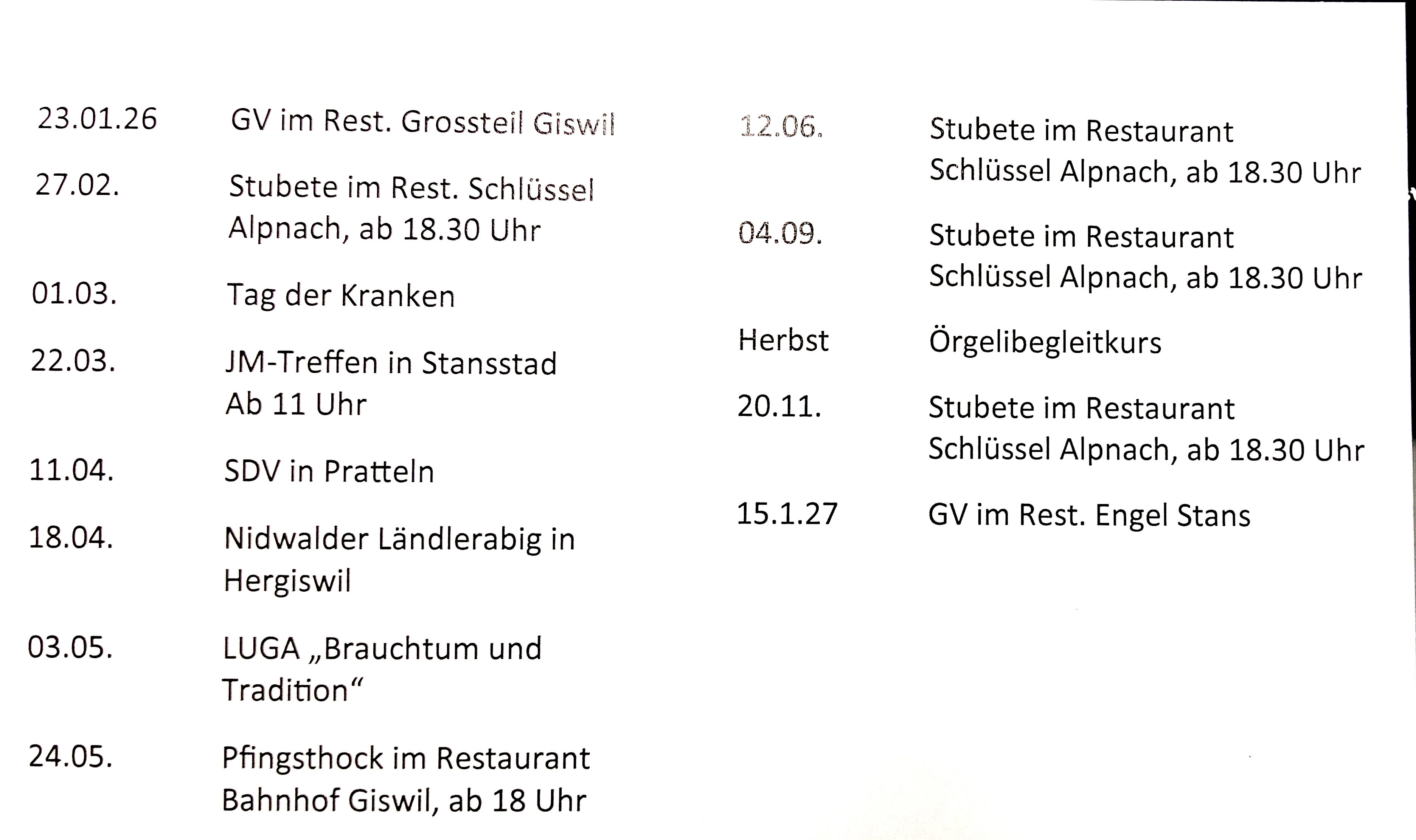 | 12. Juni 2026 | Stubete im Restaurant Schlüssel Alpnach |
